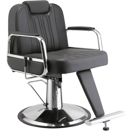 Fauteuil barbier muni d’une têtière réglable, d’une base ronde avec pompe hydraulique réglable en hauteur.