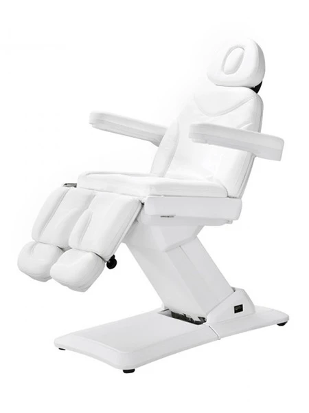 Fauteuil de podologie haut de gamme à structure très stable. Il est équipé avec 3 moteurs qui contrôlent la hauteur, le dossier et l’assise. Les jambières sont réglables de façon indépendante par vérin à gaz en vue de faciliter l’utilisation optimale au professionnel. Accoudoirs réversibles et repose-tête réglable. Revêtement en PU blanc de haute qualité et facile à nettoyer.