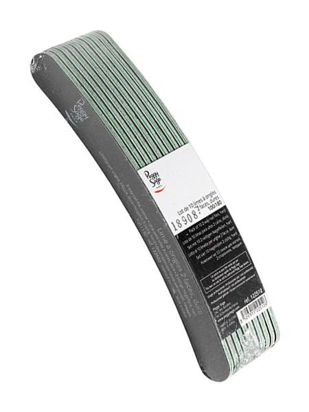 10 limes à ongles 2 faces, lavables. Leur forme ergonomique permet un limage rapide et précis. Grain 100/180 (dur).