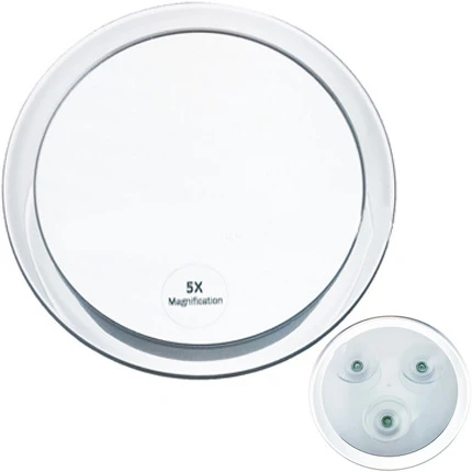 Miroir en plexiglass, grossissant 5 fois. Avec ventouse.
