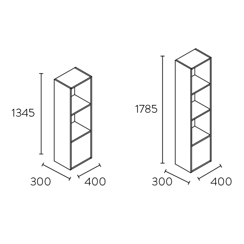 Présentoir design avec 4 espaces de rangement dont un espace fermé par porte au bas.
