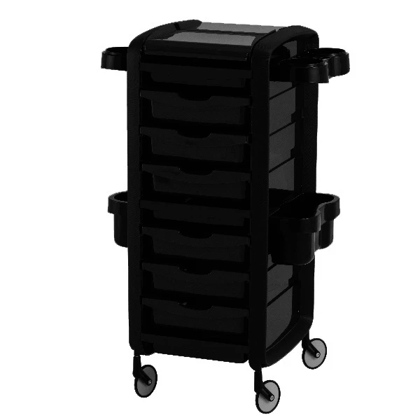 Table de service sur roulettes, avec 9 tiroirs et rangements latéraux amovibles.
